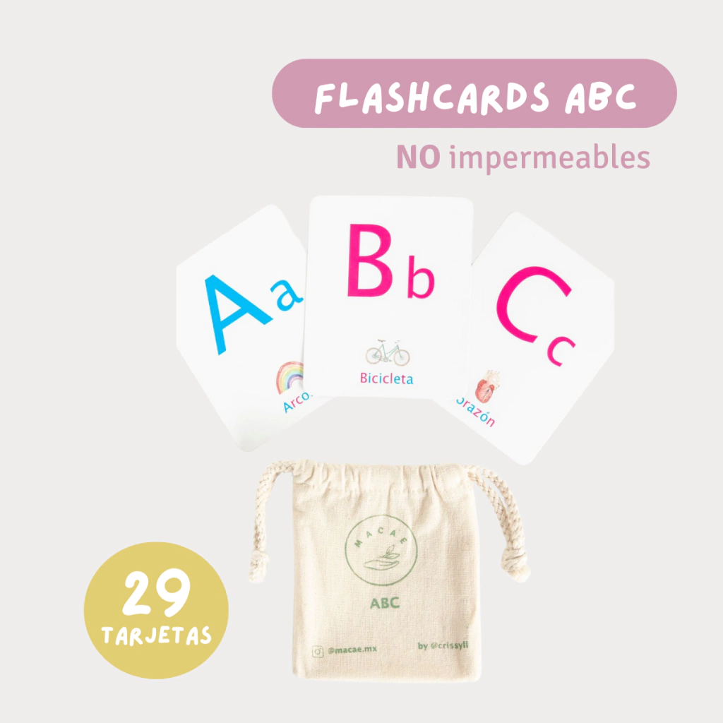Flashcards ABC, el abecedario en mayúscula y minúscula con una imagen (ilustrada por la artista argentina Cris Lienau) y palabra que inicia con su letra.