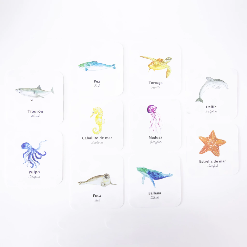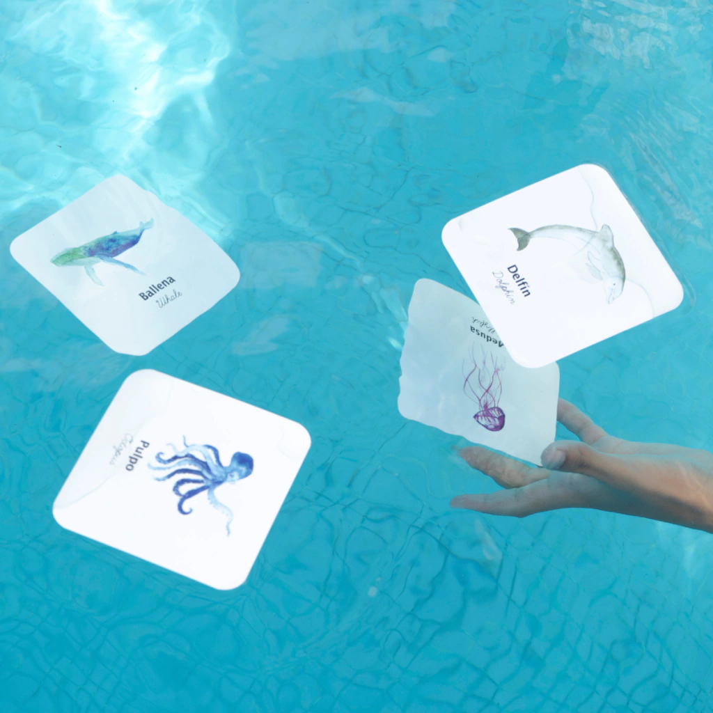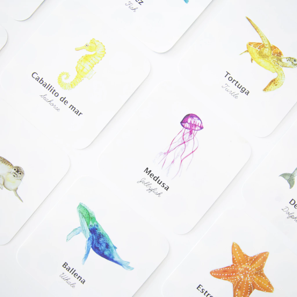 Características: Cada caja contiene 10 tarjetas de 9x9 cm repelentes al agua y la suciedad, con una ilustración en acuarela con su nombre en español (letra molde) e inglés (letra cursiva). Materiales no tóxicos. Vienen en caja de cartón de 10x10 cm.