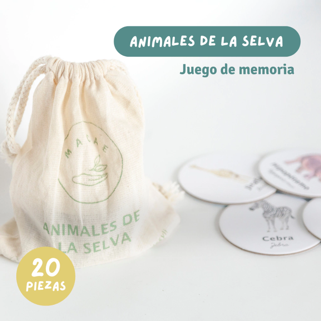 El memorama más lindo que viste, con ilustraciones de la artista Argentina Cris Lienau,10 animales en fichas de 8 cm de diámetro, ideales para el manejo de las manos de chicos y grandes. Vienen acompañadas de sus nombres en español (letra imprenta) e inglés (letra cursiva).