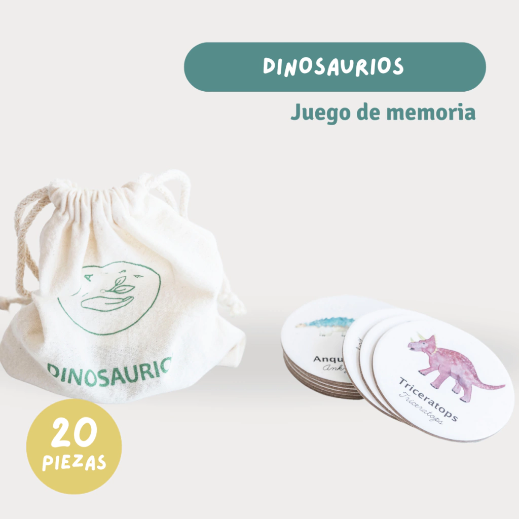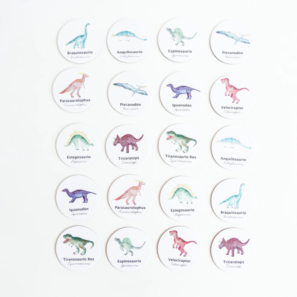 El test de memoria con las ilustraciones más lindas que viste, hechas en acuarela por de la artista Argentina Cris Lienau, 10 dinosaurios en fichas de 8 cm, ideales para el manejo de las manos de chicos y grandes. Vienen acompañadas de sus nombres en español e inglés.