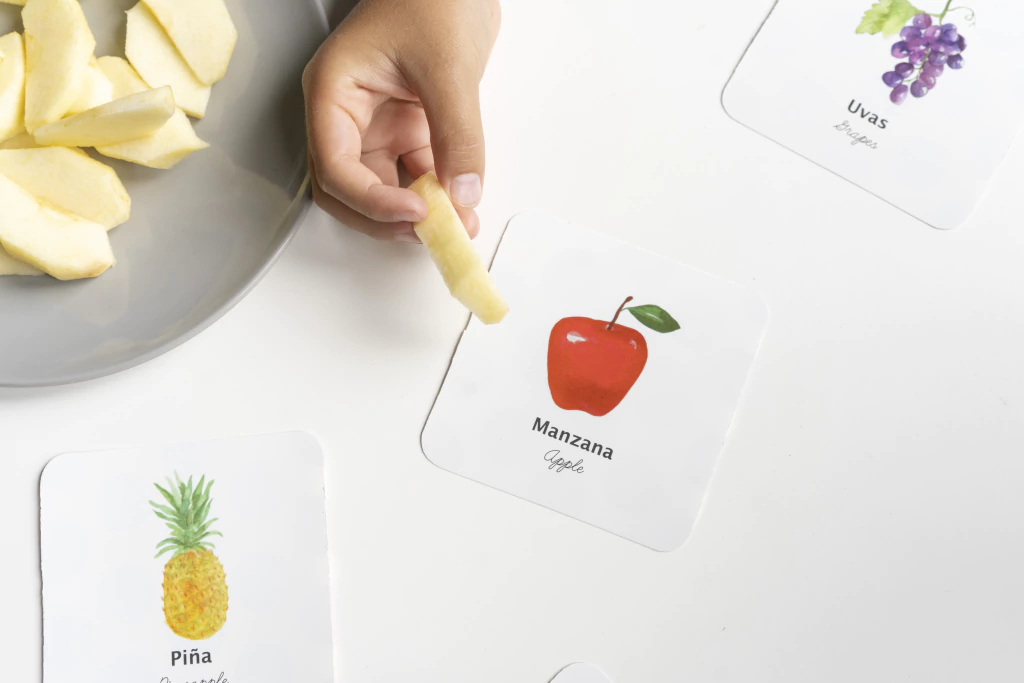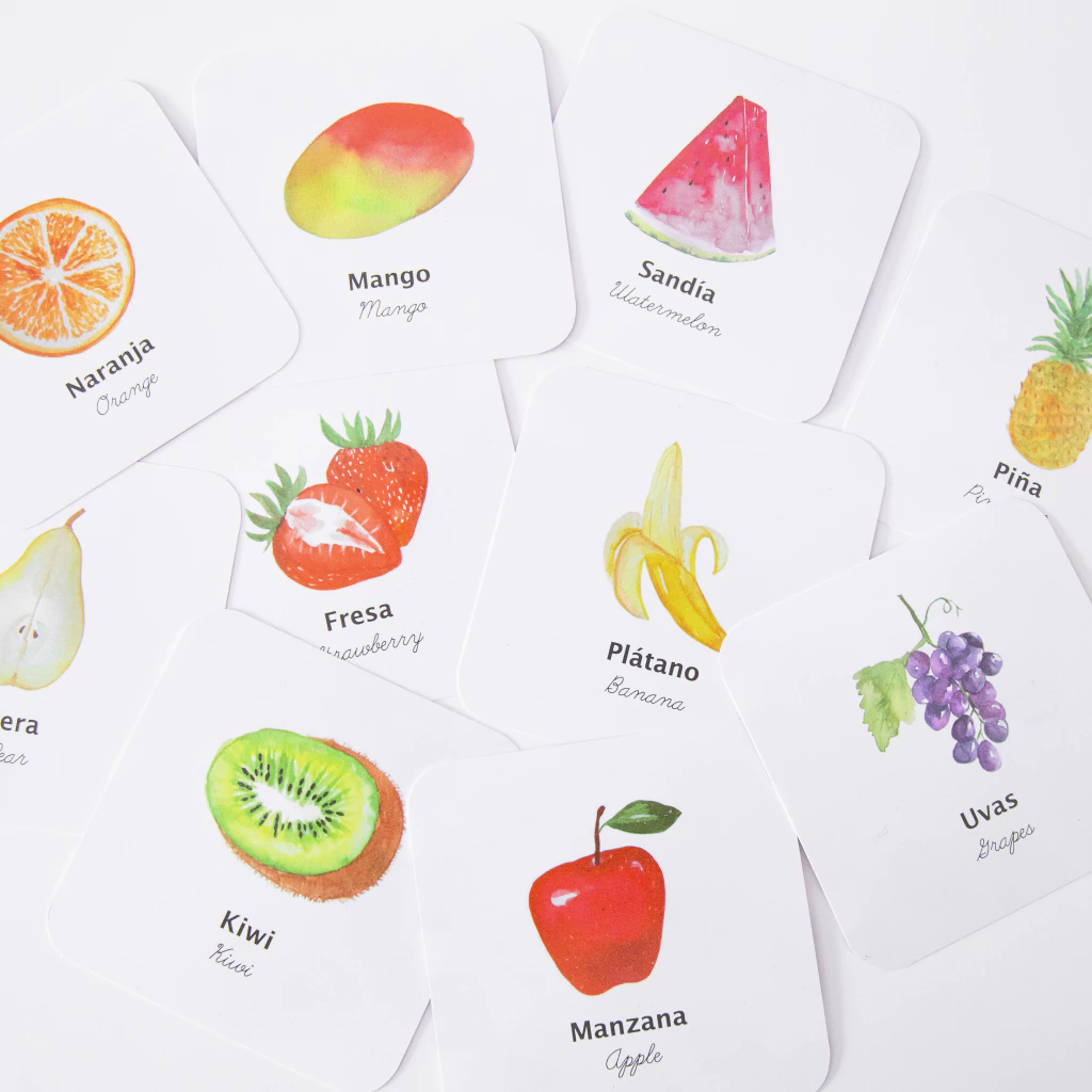 Características: Cada caja contiene 10 tarjetas de 9x9 cm repelentes al agua y la suciedad, con una ilustración en acuarela con su nombre en español (letra molde) e inglés (letra cursiva). Materiales no tóxicos. Vienen en caja de cartón de 10x10 cm.